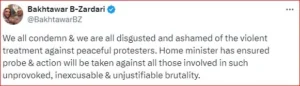 بختاور بھٹو زرداری نے مزید لکھا ہے کہ پُرامن مظاہرین پر تشدد انتہائی ناگوار اور شرمندگی کا باعث ہے۔